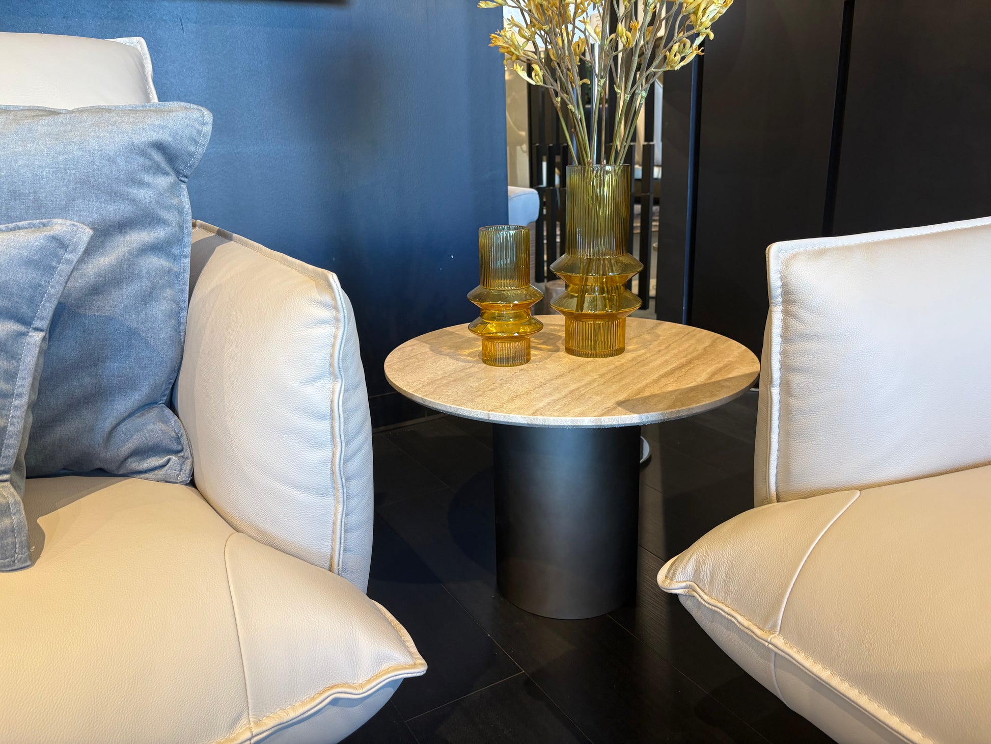 This marble side table is from Eforma as part of their Cilindro collection. The table's design focuses on the geometrical designs of cylinders with the night black base and highlights curves in the edges of the piece with the round crafted marble top.